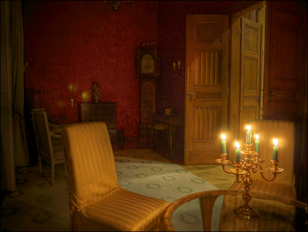 The figure in the doorway was gaunt to the point of skeletal. The hair piled into an intricate coiffure atop her head was black with threads of silver glittering in its darkness. The only light came from a candelabra clutched in her bony fingers.. Flickering flames pulled hints of crimson from her velvet gown.