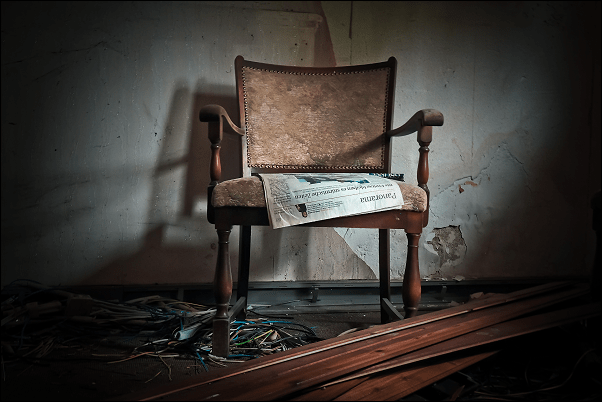 Uncle Edward’s chair stands by the hearth awaiting his return, a folded Jewish newspaper, across its faded floral seat. The room’s once paisley covered walls are water-stained and peeling like dead skin. Above the dust, a musky perfume lingers as if to mark Belle’s passage.