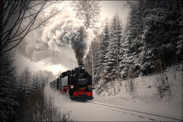 Steam billowed behind the red locomotive, creating a long winding trail through the forest. The passenger car vibrated as it surged forward, wobbling to the left, then the right, making me nauseas. I hated riding on the train and longed to be outside playing in the snow. “Later,” Mother said. “We’re almost at your grandparents’ farm. Be patient.” She gave me a peppermint, which helped a bit and I remember falling asleep, which was a relief. I still remember the horrendous whine that woke me from a pleasant dream.