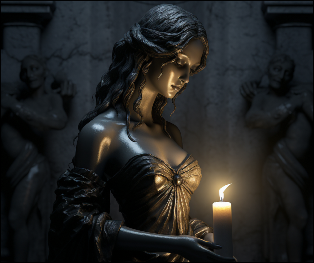 The chamber was hushed with the steady flicker of candlelight. Its glow clung to a figure of a woman in flowing stone robes. Her head bowed. Her beauty caught somewhere between mourning and serenity. Behind her loomed the carvings of tormented figures, twisted in an eternal struggle. Their eyes wide in silent agony.