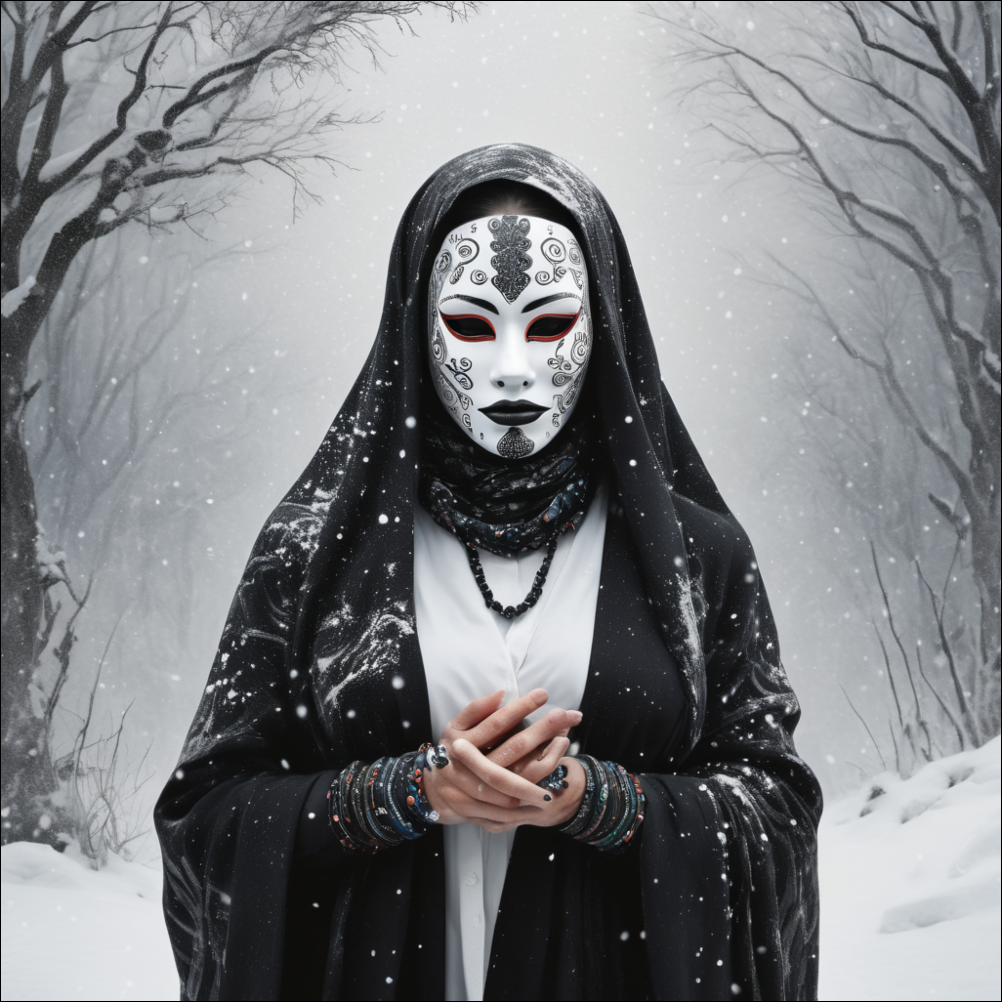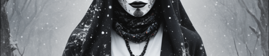 Rounding a corner, Tom skidded to a halt, nearly bowling over a woman dressed in white with a black hooded cloak and ornate mask. The eyes of the mask were rimmed in a blood red and its lips as black as coal. Within those eyeholes an inky void lived.
