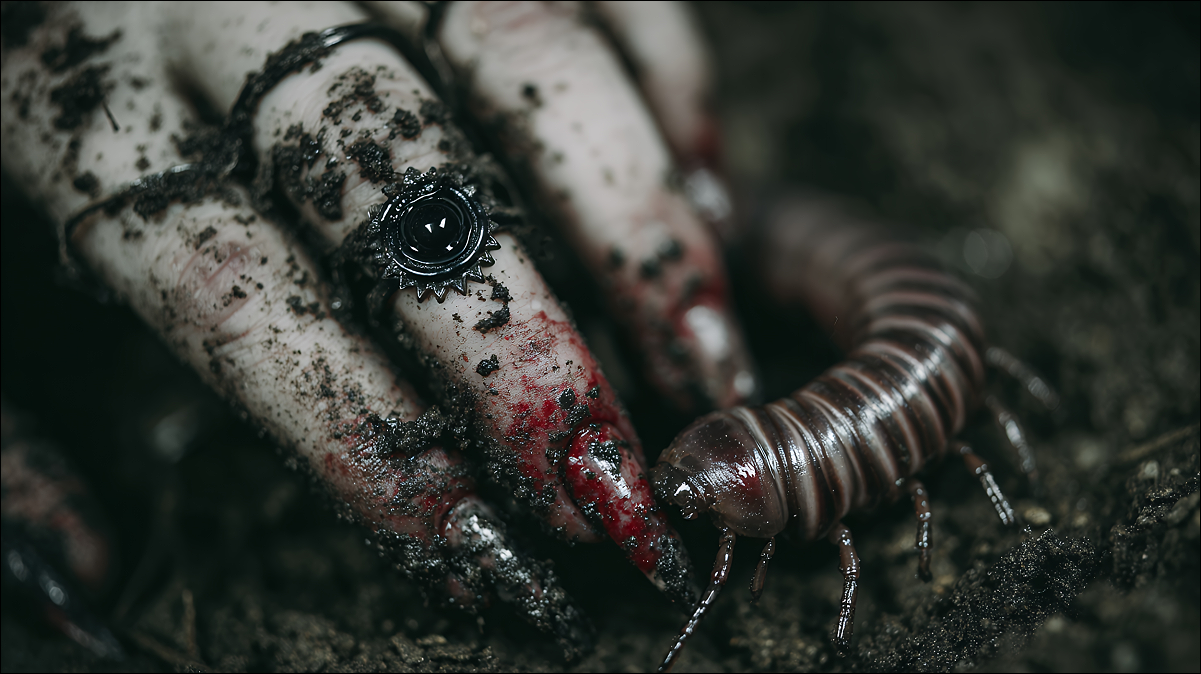 It began as a faint disturbance near her knuckles, subtle enough to be mistaken for settling dirt. Then came the unmistakable sensation of legs. Fine. Numerous and methodical. They criss-crossed the back of her hand. A millipede had surfaced from the loose soil near her wrist, drawn by the warmth that lingered stubbornly in buried flesh. It paused at the base of her finger, antennae working, tasting the salt and damp that seeped from her skin before continuing to the tight metal circle.