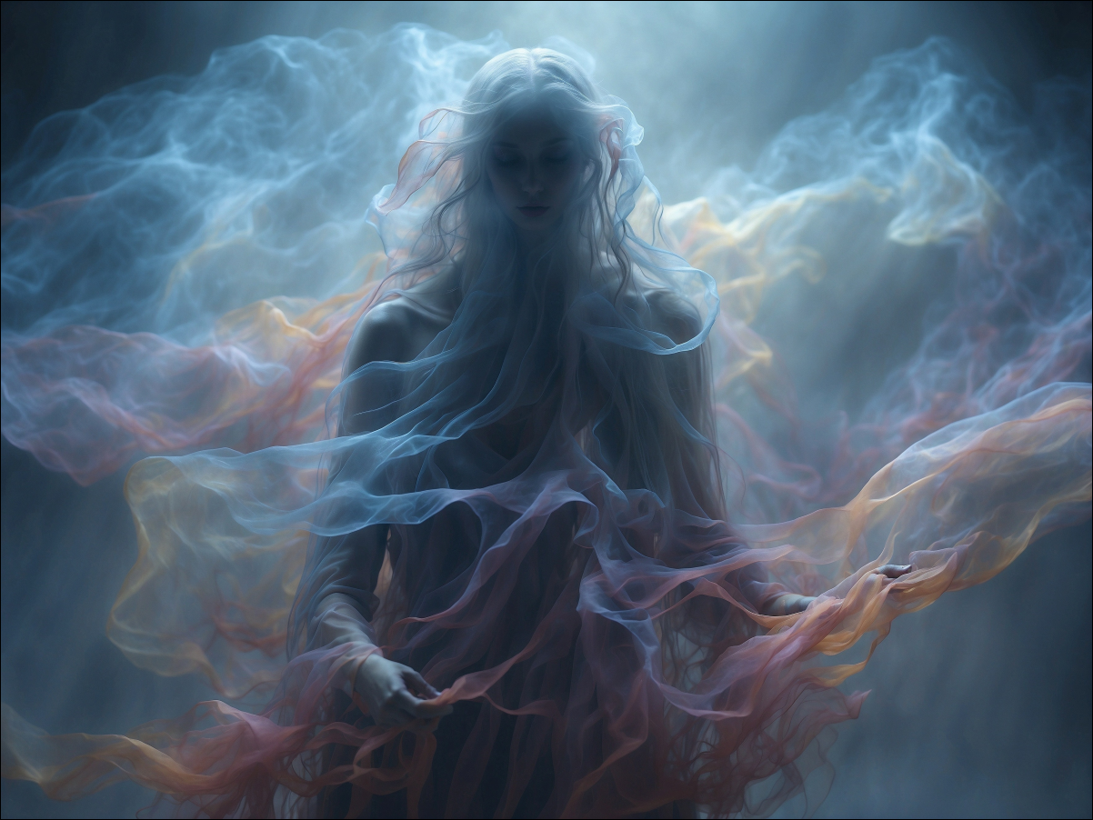 The first time I saw her was in a dim apartment hallway years later, when the building’s ancient radiator hissed and filled the air with a metallic vapor. The mist did not disperse. It thickened. It drew inward, folding over itself with deliberate grace, until it suggested the curve of a shoulder. The fall of something like hair. Pale ribbons drifted outward from her body as if she was woven from breath made visible. She was neither solid nor transparent.