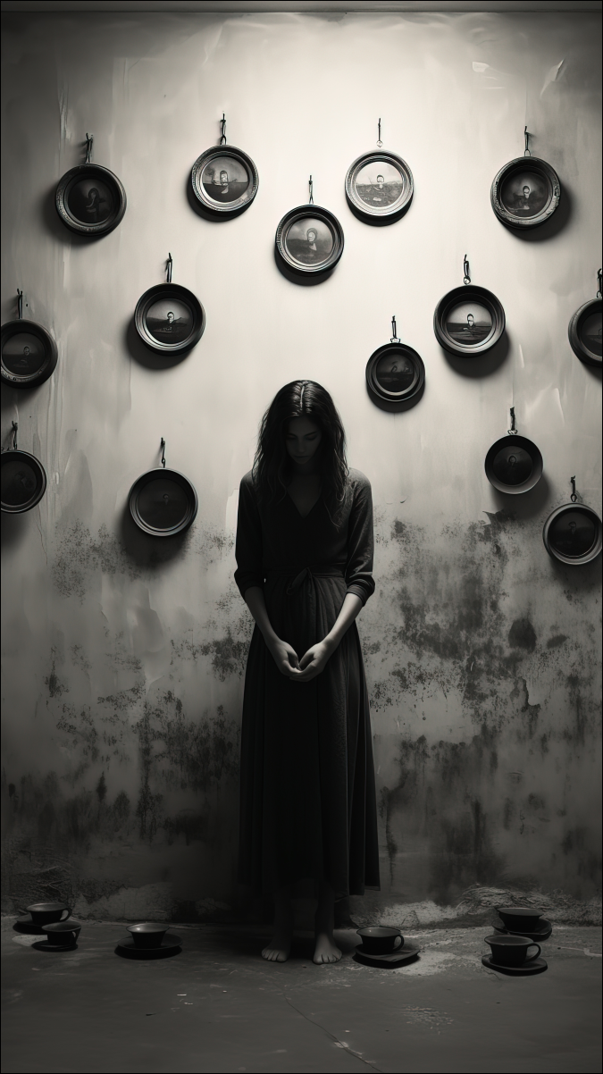 The noise filled the kitchen, not loud but total, vibrating through bone and thought. A chorus of voices that had been held too long and were finally granted release. Beneath them the stains began to move, darkening. Loosening. Then dripping in thick, black strands that slid toward the floor.